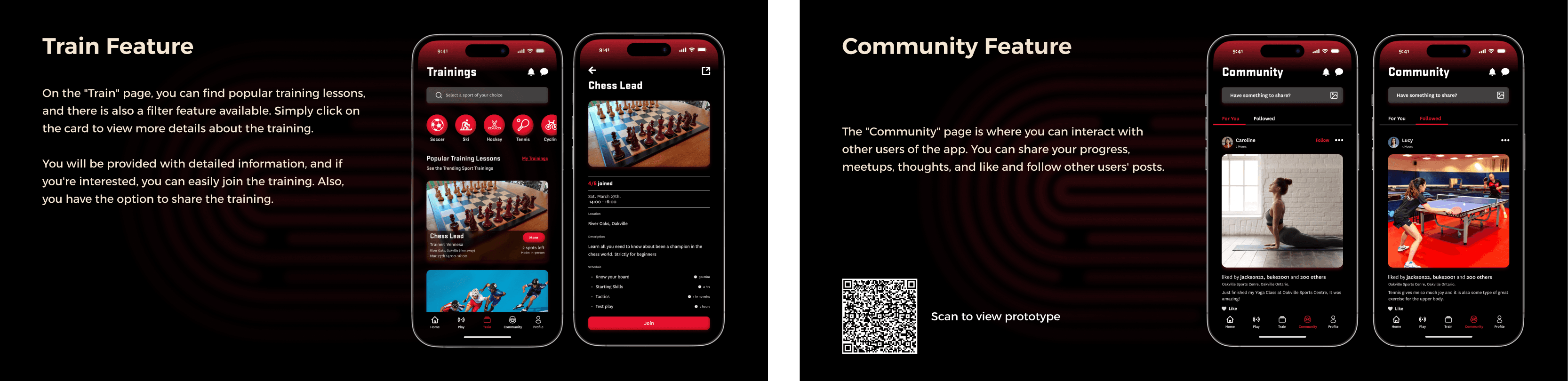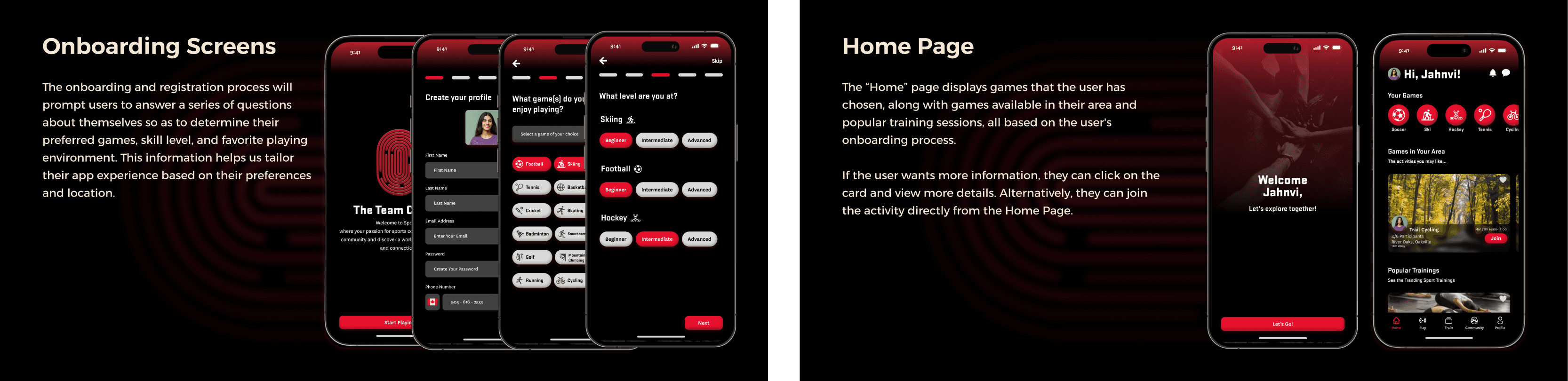 Designed a multi‑flow mobile app with onboarding, sport matching, community features, and event planning