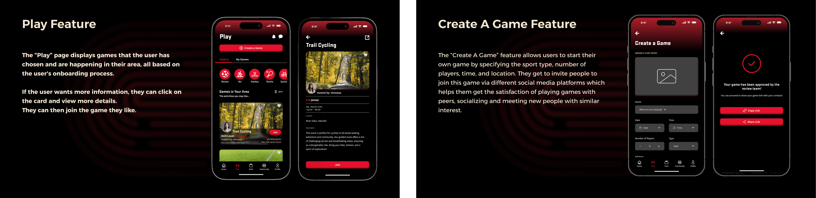Play: Users can join existing games matching their preferences and location. They also have the option to start their own game by specifying the sport type, number of players, time, and location.